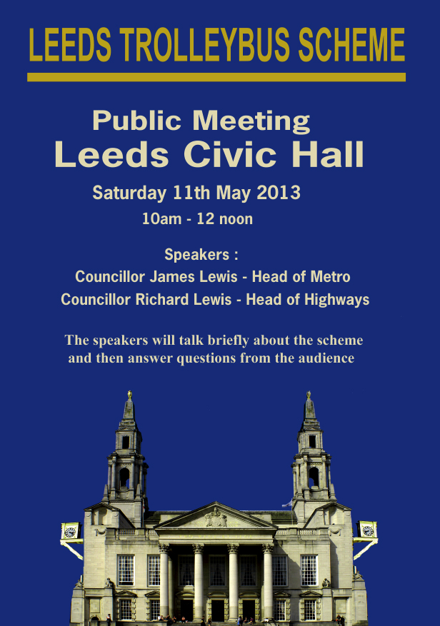 At 10am this Saturday the 11th May, Councillor Richard Lewis, the head of Highways, will be at Leeds Civic Hall to answer questions on the proposed trolleybus scheme. Councillor James Lewis, the head of Metro, will also be attending the meeting and answering questions.